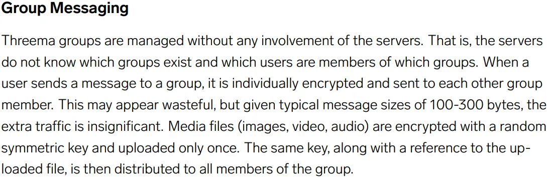 As far as security is concerned, groups are encrypted just as well as direct messages, they utilize Perfect Forward Secrecy thanks to Threema's Ibex protocol.